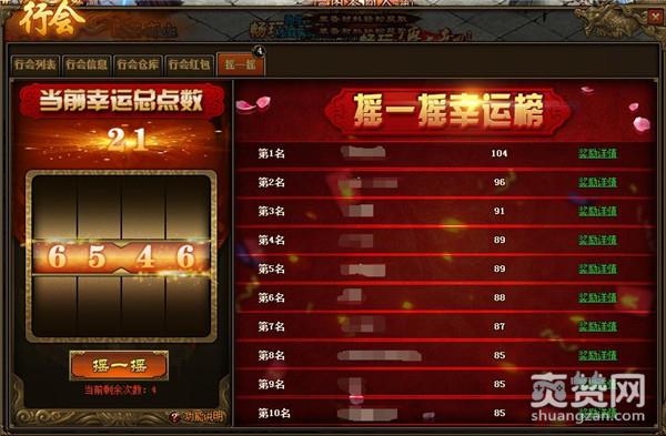 行会系统有新颖的摇一摇玩法。每位行会成员每天有5次摇一摇的机会。每次会摇出5个数字,五个数字相加之和则为幸运点数。每次幸运点数相加,则为当前幸运总点数。进入摇一摇幸运榜前10名,就能上榜并获得奖励。