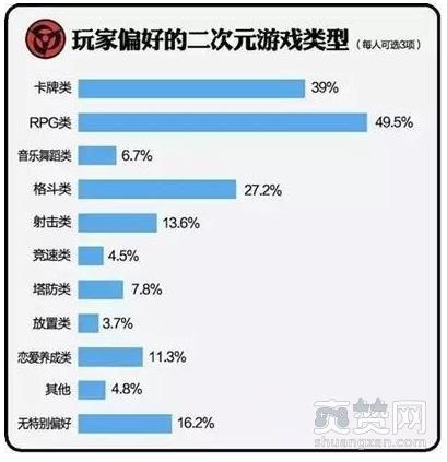 根据腾讯游戏对二次元用户的调查,用户偏爱的游戏类型排名前两位为RPG类和卡牌类,两者占比分别为49.5%和39%。值得注意的是,二次元游戏中的RPG类和卡牌类具有日系典型特征,以JRPG、日式卡牌类为主。也正因为此,二次元游戏在突破日本市场上拥有优势(具体可以参考《日本移动游戏市场发展机会研究报告》)。