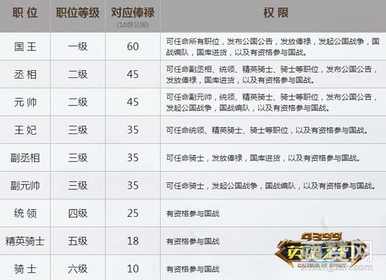 每个公国将职位分为6个职位等级,按照不同的公国等级、不同职位等级的公国成员可获得对应每周俸禄;俸禄奖励为精英勋章。女性职位需要对方同意才能任命成功。