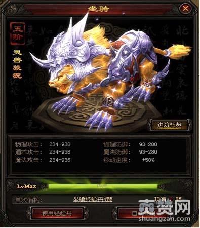 灵兽狻猊还有额外属性——生命上限+2%,使用经验丹就能为这个坐骑升级喔!萝卜玩传奇皇朝的坐骑是可以升阶的,五阶就是这个灵兽狻猊了,六阶是凶兽穷奇,七阶是金翅大鹏,八阶是圣火麒麟,九阶是不灭凤凰,而十阶就是超华丽的神兽青龙啦!青龙可是中国古代最令妖邪胆颤且法力无边的四大神兽之一喔!