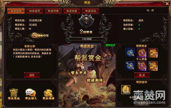 一开始的帮派信息上,我们可以窥探到它的全貌。从帮派名到商城、聊天、俸禄等,帮派会因等级不同获得不一样的帮派赏金,目前尚未开启,大伙可以好好期待一下。右侧可以看到自己在帮派中的职位,帮派中总的资金以及个人资金。每天千万别忘记去签到喔,直接就能拿到数万的傲天神印王座金币奖励。