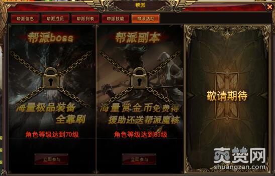 帮派活动,分别需要角色达到70级和83级才能开启。傲天神印王座小编也还没够等级,只能简单看看传说中全靠刷的海量极品装备副本“帮派BOSS”,“帮派副本”从尚未解锁的外面了解到它可以获得海量金币以及帮派魔核。