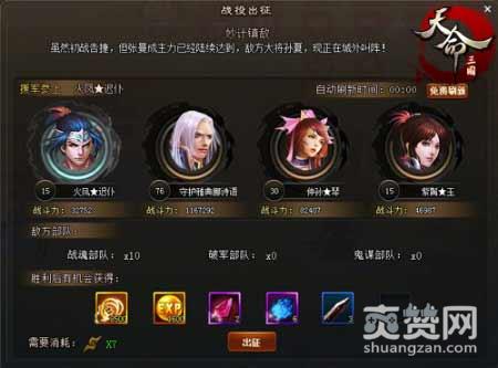当玩家等级达到13级,即可开启战役系统。玩家进入战役模式后,先选择所要攻打的战役。击进入后会让玩家在四个其他玩家援军中选择一个协助,可以参照战力高的援军,点击出征按钮即可开战。在战役中可以使用鼓舞气势增加军队的攻击力和生命,这样更容易取得胜利,也可以使用托管功能自动进行。