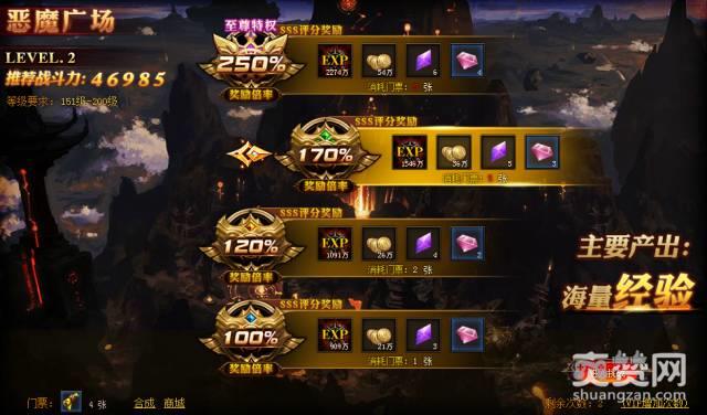 相较于血色城堡,恶魔广场可以说就是一个提供海量经验的活动。在恶魔广场中,打怪的效率越高,时间花费的越少,获得的经验就越多,收益也就越大。经验药水与恶魔广场提供的经验是叠加的,所以要珍惜每天的次数和经验药水,用在刀刃上才能将收益最大化。另外多使用攻击力更高的大范围AOE技能也能够更加轻松的击杀怪物。