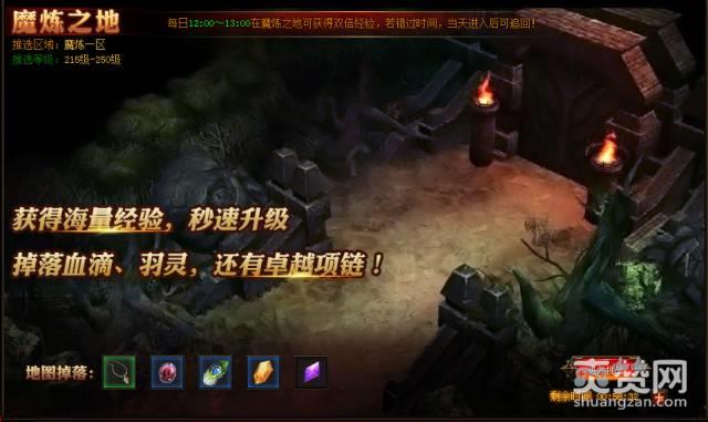 魔炼之地,一个充满腐朽气息和危险的禁地,最勇猛的战士也不敢进入的死亡之地,传说在那里生存着整个奇迹大陆中前所未见的魔怪。魔炼之地每天早上8点到晚上12点开放,除了大量刷怪点之外,在每天中午12点到13点可以获得双倍经验,值得一提的是,经验药水同样有效,因此在这一个小时内挂机刷怪即可获得大量经验。魔炼之地的怪物十分密集,拥有大范围AOE技能是非常具有优势的,法师的黑龙波、召唤的烈光闪、战士的霹雳回旋斩、弓箭手的五重箭,都是很强力的刷怪技能。