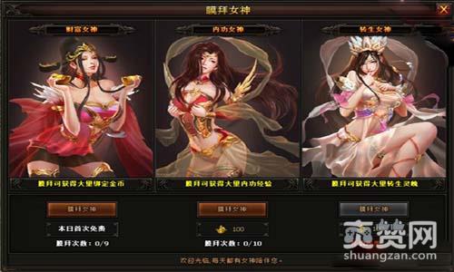 在游戏界面的上方,玩家可以一眼就看到膜拜女神图标,点击即可打开膜拜界面。目前,游戏中的膜拜女神分为三种,依次是财富女神、内功女神和转生女神,别看她们个个妖娆多姿,其实本事却也是相当大呢。玩家可以通过膜拜这三位女神就可以得到丰厚的金币、内功值和转生灵魄奖励了。如果你天天来膜拜,那么这些女神也是会天天陪伴你哦,那真可谓是等级美人两不误哈