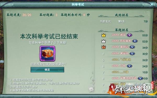 达到前10名的玩家,每个人都可获得科举考试给予的福利礼包。状元可获得“状元礼包”,还能获得1000绑定元宝、50000银两;榜眼可获得900绑定元宝、45000银两;探花的奖励也不次,可获得800绑定元宝、40000银两;入围4-10名的选手可获得700绑定元宝、35000银两。除此之外,初次达成前10名次的玩家还可额外获得科举成就!