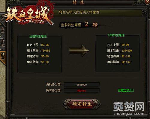 当然,这么逆天的属性对战斗力的增长是显而易见的,所以人物在达到100级以后通过降低自己的等级来兑换转生修为值,低于100级将不可降级兑换修为!每天限制兑换3次;另一个获得修为值的方法就是通过商城购买转生丹。高级转生丹,100级方可使用,双击后增加100W转生修为,超级转生丹,100级时使用,双击增肌1000W转生修为。这么逆天的属性,可以如此轻易的获得,还在等什么?快来51《铁血皇城》一战!