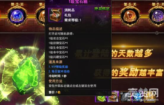 其次是1级宝石箱一共5枚,可以镶嵌在装备上提升各种属性,随机打开可以得到:攻击、防御、生命、命中、闪避等宝石。关于傲天神印王座宝石多补充一句,每日首充可以获得,还有就是VIP等级奖励可拿到。