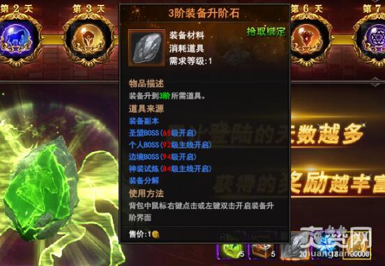 看看后面的三阶装备升阶石,傲天神印王座初级玩家提升到中级的好宝贝。登录第一天就送出20个,开发组也是蛮有气魄的。寻常时候,想要获得它非装备副本、装备分解、圣盟BOSS、个人BOSS、边境BOSS、神装试炼不能获取,一大半的活动都是凶险无比,千万要担心喔。