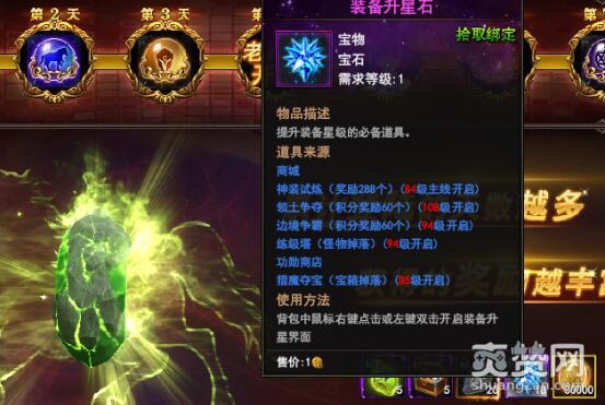 这个应该认识吧,装备升星石,傲天神印王座中仅次于装备升阶石的材料;可以将装备星级属性充分发挥出来,星级越高战斗力越强。还有30000金币就不用我再介绍了吧,看过了第一天奖励,是不是很眼馋呢?别急,后面还有更好的,比如老司机头衔等。