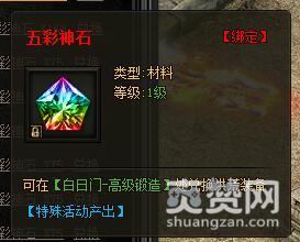 五彩神石。类型:材料,等级:1级,可在【白日门-高级锻造】处兑换洪荒装备。获得方式:特殊活动产出。