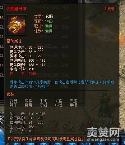 洪荒旭日甲。类型:衣服,等级:90级,职业:通用,性别:通用。基础属性——物理攻击:88-220,魔法攻击:88-220,道术攻击:88-220,物理防御:188-471,魔法防御:188-471,生命上限:426,内力:+349。受到攻击时有5%几率触发,使攻击者附带【虚弱效果】,降低攻击者1280攻击,持续5秒。套装:武器、戒指、手镯、头盔、衣服、靴子、腰带、项链、戒指、手镯。攻击:110-275,物理防御:94-235,魔法防御:94-235,生命上限:752,内力:+617。【洪荒装备】与常规装备可同时使用且属性叠加。