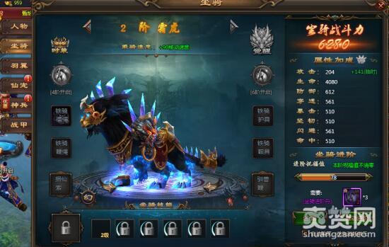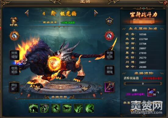 直接跨过第3阶,来了解一下4阶极光豹。有着烈火一样的燃情,有着闪电一样的速度,战力升高的同时移动速度加成似乎有些下降,只能达到+80%。各方属性的实力对比着实让傲天乾坤战纪小编吓了一跳:攻击+10598,生命222760,其他各种属性都是上万的加成,一个4阶坐骑总的战力预估一下在数十万之多。