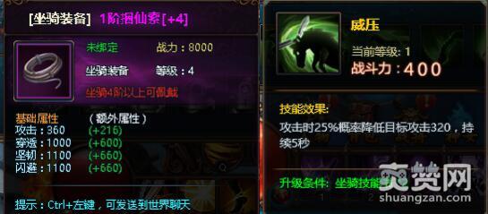 先前提到坐骑装备,关于坐骑装备有哪些?一共有坐骑马鞍、坐骑繮绳、坐骑蹄铁、坐骑马镫、捆仙索和驯兽索六大装备。坐骑装备可以提升玩家各种属性加成,坐骑装备也是具有品阶之分的;随着坐骑等阶的提升,将能装备到更高等阶的坐骑装备。傲天乾坤战纪中坐骑装备的获得不那么容易,需要通过参与击杀世界BOSS等活动来赚取。看看上面的1阶捆仙索(+4),战斗力+8000,坐骑4阶可以佩戴。千万别小看坐骑,坐骑还有自己特殊的技能,学习技能、提升技能都能让人物战力大幅飙升。
