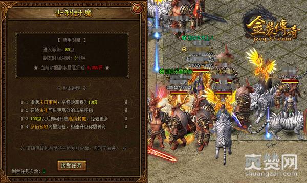 在37《金装传奇》中,玩家每日可进行3次古刹封魔副本,与比奇城的古刹封魔NPC对话之后,根据不同等级,则可分别进入普通封魔地图和高级封魔地图。古刹封魔开启后,玩家每次可以召唤10至15个守卫,使用令牌还可召唤法师与法神,有它们的强劲战斗,古刹定能固若金汤,让怪物大军兵败如山倒。