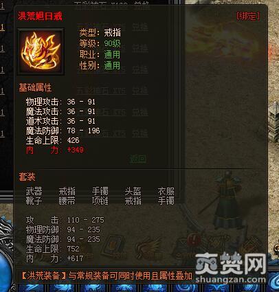 洪荒旭日戒。类型:戒指,等级:90级,职业:通用,性别:通用。基础属性——物理攻击:36-91,魔法攻击:36-91,道术攻击:36-91,魔法防御:78-196,生命上限:426,内力:+349。套装:武器、戒指、手镯、头盔、衣服、靴子、腰带、项链、戒指、手镯。攻击:110-275,物理防御:94-235,魔法防御:94-235,生命上限:752,内力:+617。【洪荒装备】与常规装备可同时使用且属性叠加。