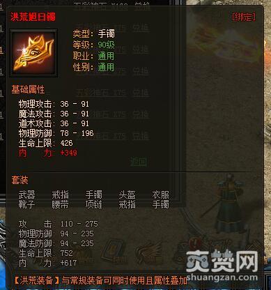 洪荒旭日镯。类型:手镯,等级:90级,职业:通用,性别:通用。基础属性——物理攻击:36-91,魔法攻击:36-91,道术攻击:36-91,物理防御:78-196,生命上限:426,内力:+349。套装:武器、戒指、手镯、头盔、衣服、靴子、腰带、项链、戒指、手镯。攻击:110-275,物理防御:94-235,魔法防御:94-235,生命上限:752,内力:+617。【洪荒装备】与常规装备可同时使用且属性叠加。