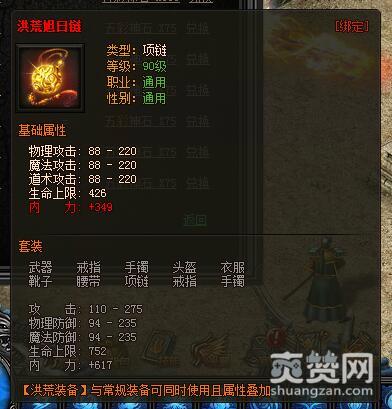 洪荒旭日链。类型:项链,等级:90级,职业:通用,性别:通用。基础属性——物理攻击:88-220,魔法攻击:88-220,道术攻击:88-220,生命上限:426,内力:+349。套装:武器、戒指、手镯、头盔、衣服、靴子、腰带、项链、戒指、手镯。攻击:110-275,物理防御:94-235,魔法防御:94-235,生命上限:752,内力:+617。【洪荒装备】与常规装备可同时使用且属性叠加。