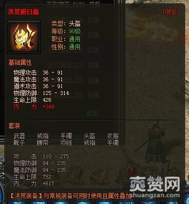 洪荒旭日盔。类型:头盔,等级:90级,职业:通用,性别:通用。基础属性——物理攻击:36-91,魔法攻击:36-91,魔法攻击:36-91,道术攻击:36-91,物理防御:125-314,生命上限:426,内力:+349。套装:武器、戒指、手镯、头盔、衣服、靴子、腰带、项链、戒指、手镯。攻击:110-275,物理防御:94-235,魔法防御:94-235,生命上限:752,内力:+617。【洪荒装备】与常规装备可同时使用且属性叠加。