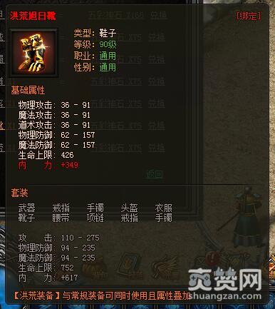 洪荒旭日靴。类型:鞋子,等级:90级,职业:通用,性别:通用。基础属性——物理攻击:36-91,魔法攻击:36-91,道术攻击:36-91,物理防御:62-157,魔法防御:62-157,生命上限:426,内力:+349。套装:武器、戒指、手镯、头盔、衣服、靴子、腰带、项链、戒指、手镯。攻击:110-275,物理防御:94-235,魔法防御:94-235,生命上限:752,内力:+617。【洪荒装备】与常规装备可同时使用且属性叠加。