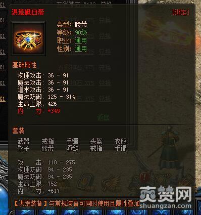 洪荒旭日带。类型:腰带,等级:90级,职业:通用,性别:通用。基础属性——物理攻击:36-91,魔法攻击:36-91,道术攻击:36-91,魔法防御:125-314,生命上限:426,内力:+349。套装:武器、戒指、手镯、头盔、衣服、靴子、腰带、项链、戒指、手镯。攻击:110-275,物理防御:94-235,魔法防御:94-235,生命上限:752,内力:+617。【洪荒装备】与常规装备可同时使用且属性叠加。