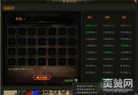 有个概念玩家们可能回弄错,这个萝卜玩逐日战神的回收系统不是我们常说的那种回收哦,言归正传,选择需要回收的装备等级,即可放入对应的装备,装备回收可以获得经验和符魄。回收的装备无法做赎回,请玩家慎重选择可回收装备。