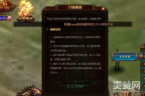 “参加门派挑战可获得排名奖励,排名越高,奖励越丰厚”,傲天烈火封神江湖上的童谣都在传唱这样一个故事。门派挑战是所有玩家必须经历的一个修炼场所,想要扬名立万,想要出人头地,通常江湖上都会先看看你的排名。想要获得傲天烈火封神中的江湖排名,你必须每天参加门派挑战;挑战成功后会刷新你的江湖排名,并刷新你的排名奖励。凭实力说话,其实门派挑战就这么简单!