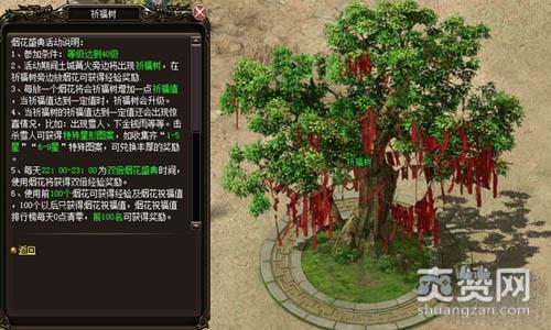 萝卜玩《烈火战神》祈福树烟花盛典的活动详情:1、活动期间土城旁边将出现祈福树,在旁边燃放烟花可获得经验奖励;2、每放一个烟花将会增加一点祈福值,当祈福值达到一定值时,祈福树会升级;3、当祈福树的祈福值达到一定值还会出现惊喜情况,比如:出现雪人、下金钱雨等等,击杀雪人可获得特殊星型图案,收集可兑换丰厚的奖励;4、每天22:00-23:00为双倍烟花盛典时间,使用烟花将获得祈福树奖励双倍经验奖励。