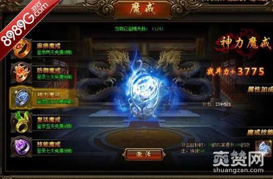 连续登录8989g烈火封神第二天即可激活麻痹戒指,虽然说麻痹戒指是烈火封神里面的初级戒指,但是其威力可不小,一旦激活即可拥有9000+的惊人战力提升,命中目标时轩辕/九黎三清有20%/10%的几率麻痹目标,使其在一秒内无法移动和攻击,这一刻任你宰割。
