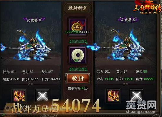 在XY游戏《三国群雄传》中的官职系统分为:伍长、都伯、校尉、中郎将以及伏波将军等等,而关羽作为武圣更有专属官职汉寿亭侯!玩家只要消耗相应军功便可以轻松提升关羽的官职,每次提升官职不仅关羽的各项属性会大幅增长之外,战斗力更是狂飙不止!当关羽在成为伏波将军时便会激活“统帅”技能,增加小兵100%的伤害,而成为汉寿亭侯时更会激活“单挑”技能,让关羽进入单挑战场时补满怒气狂战八方!