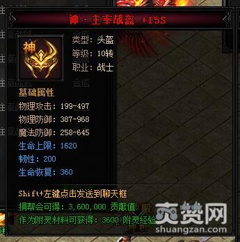 神·主宰战盔。类型:头盔,等级:10转,职业:战士。基础属性——物理攻击:199-497,物理防御:387-968,魔法防御:258-645,生命上限:1620(蓝色),韧性:200(蓝色),生命恢复:360(蓝色)。捐帮会可得:3600000贡献值,作为附灵材料可获得:3600附灵经验。与普通10转装备相比,神装追加了生命上限、韧性和生命恢复三条蓝色属性,同时捐帮会可得的贡献值也比普通装备多出了50%。