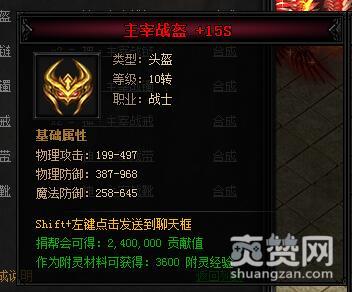 主宰战盔。类型:头盔,等级:10转,职业:战士。基础属性——物理攻击:199-497,物理防御:387-968,魔法防御:258-645,捐帮会可得:2400000贡献值,作为附灵材料可获得:3600附灵经验。
