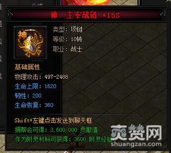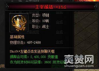 主宰战链。类型:项链,等级:10转,职业:战士。基础属性——物理攻击:497-2488,捐帮会可得:2400000贡献值,作为附灵材料可获得:3600附灵经验。
