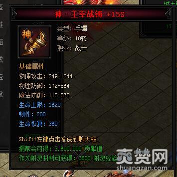 神·主宰战镯。类型:手镯,等级:10转,职业:战士。基础属性——物理攻击:249-1244,物理防御:172-864,魔法防御:115-576,生命上限:1620(蓝色),韧性:200(蓝色),生命恢复:360(蓝色)。捐帮会可得:3600000贡献值,作为附灵材料可获得:3600附灵经验。与普通10转装备相比,神装追加了生命上限、韧性和生命恢复三条蓝色属性,同时捐帮会可得的贡献值也比普通装备多出了50%。