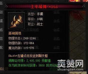 主宰战镯。类型:手镯,等级:10转,职业:战士。基础属性——物理攻击:249-1244,物理防御:172-864,魔法防御:115-576,捐帮会可得:2400000贡献值,作为附灵材料可获得:3600附灵经验。
