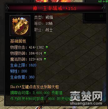 神·主宰战戒。类型:戒指,等级:10转,职业:战士。基础属性——物理攻击:414-1382,物理防御:184-614,魔法防御:123-409,生命上限:1620(蓝色),韧性:200(蓝色),生命恢复:360(蓝色)。捐帮会可得:3600000贡献值,作为附灵材料可获得:3600附灵经验。与普通10转装备相比,神装追加了生命上限、韧性和生命恢复三条蓝色属性,同时捐帮会可得的贡献值也比普通装备多出了50%。