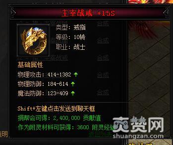 主宰战戒。类型:戒指,等级:10转,职业:战士。基础属性——物理攻击:414-1382,物理防御:184-614,魔法防御:123-409,捐帮会可得:2400000贡献值,作为附灵材料可获得:3600附灵经验。