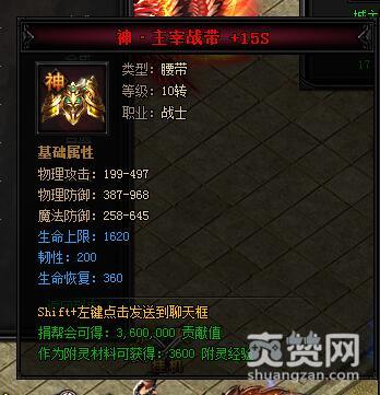 神·主宰战带。类型:腰带,等级:10转,职业:战士。基础属性——物理攻击:199-497,物理防御:387-968,魔法防御:258-645,生命上限:1620(蓝色),韧性:200(蓝色),生命恢复:360(蓝色)。捐帮会可得:3600000贡献值,作为附灵材料可获得:3600附灵经验。与普通10转装备相比,神装追加了生命上限、韧性和生命恢复三条蓝色属性,同时捐帮会可得的贡献值也比普通装备多出了50%。