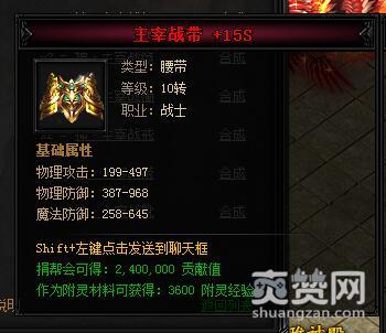 主宰战带。类型:腰带,等级:10转,职业:战士。基础属性——物理攻击:199-497,物理防御:387-968,魔法防御:258-645,捐帮会可得:2400000贡献值,作为附灵材料可获得:3600附灵经验。