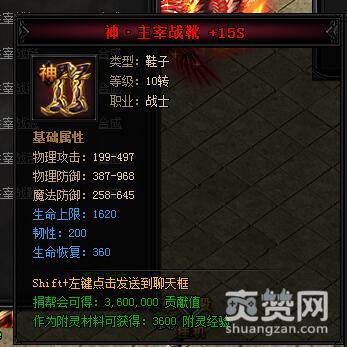 神·主宰战靴。类型:鞋子,等级:10转,职业:战士。基础属性——物理攻击:199-497,物理防御:387-968,魔法防御:258-645,生命上限:1620,韧性:200,生命恢复:360,捐帮会可得:3600000贡献值,作为附灵材料可获得:3600附灵经验。与普通10转装备相比,神装追加了生命上限、韧性和生命恢复三条蓝色属性,同时捐帮会可得的贡献值也比普通装备多出了50%。