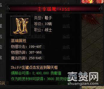 主宰战靴。类型:鞋子,等级:10转,职业:战士。基础属性——物理攻击:199-497,物理防御:387-968,魔法防御:258-645。捐帮会可得:2400000贡献值,作为附灵材料可获得:3600附灵经验。