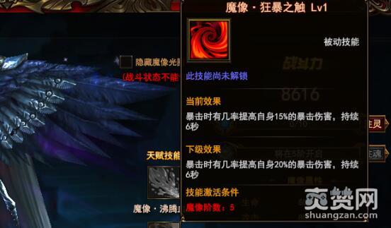 魔像?狂暴之触则是提高暴击时暴击伤害的技能,最低提升的比例为15%。这个技能要求有点高,需要傲天魔法王座中魔像阶数达到5阶才可以。