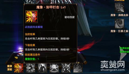 最后了解下底部的魔像潜能,原来除了魔像自身带来的战斗力、天赋技能外,魔像潜能也是提升玩家威力的重要元素。简单看一个魔像?卸甲打击,这个又是干嘛的?攻击时无视对方防御的潜能,牛吧。关于傲天魔法王座中的魔像潜能,额外还有五个,比如魔像?疾风影法等都是接下来玩家需要深入了解的。至于如何获得,仔细看看说明相信一定有不错的收获喔。