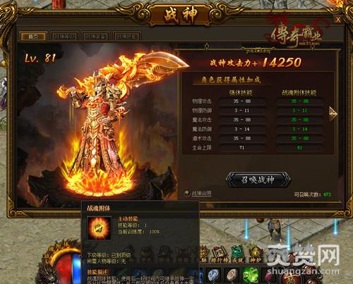 二、战神的觉醒技能强体、附体强化、附体精通也就是说你的战神越强大,你获得的属性也越厉害,战神等级也很重要,包括给战神升级装备,战神的属性越高,附体的时间越长,战神的装备是通过用“黑体晶石” 来培养战神装备的属性(开服第十五天开放);
