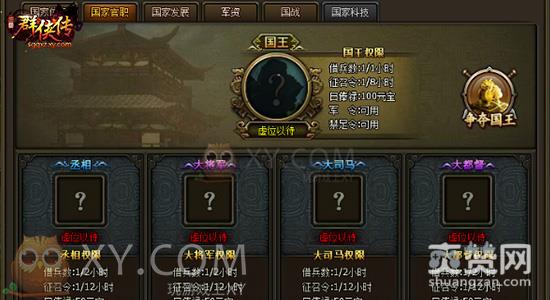 君以国士之礼待我,我必国士之智报之。在XY游戏《三国群侠传》中,一个国家的强大与否,取决于该阵营是否有着强有力的统治者管理,以及智勇双全的人才辅佐。XY游戏《三国群侠传》官职系统的出现,为这个问题提供了很好的解决方案。在游戏中每个国家的官职体系,均由一位国王以及四位一品官员组成。国王和官员可定期领取俸禄,享受每隔一段时间增加借兵次数的特权。享受了权利则必须履行义务,国王和官员必须在国战期间带领国家四方征战,使国家更为强盛,使百姓更加富庶。战前调兵遣将,战中运筹帷幄,战后积极发展,在XY游戏《三国群侠传》,国王和官员决定了整个阵营的命运发展。