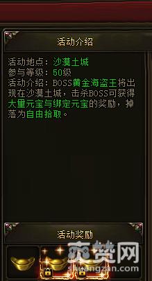 在每天的11:30-12:00、14:00-14:30和16:30-17:00中,玩家只要等级达到50级,就可参与这场元宝夺回战。在沙漠土城中,玩家们会见到boss黄金海盗王,其虽本事没多大,但钱多就够了嘛!玩家只要在活动地图中击杀boss,都可获得大量的元宝和绑定元宝,但掉落形式为自由拾取,所以,玩家不要只记得打boss,忘记拾取元宝了哦!