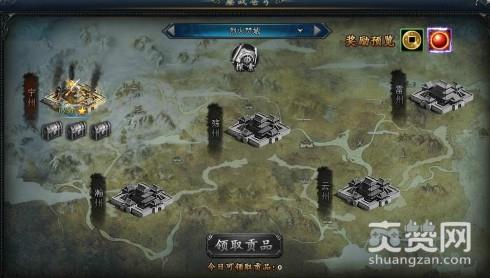 鏖战苍穹全天开放,点击图标进入主界面,主界面展示了当前章节与相应的城池。城池上标注有当前星数与最大星数。奖励预览为鏖战苍穹玩法主要产出的道具—铜钱和突破丹。而城池下方的三个宝箱,便是每日贡品。