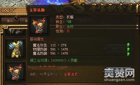 主宰法袍。类型:衣服,转生:7转,职业:法师,性别:男。基础属性——魔法攻击:112-279,物理防御:591-1476,魔法防御:591-1476,捐工会可得:2430000个人贡献。