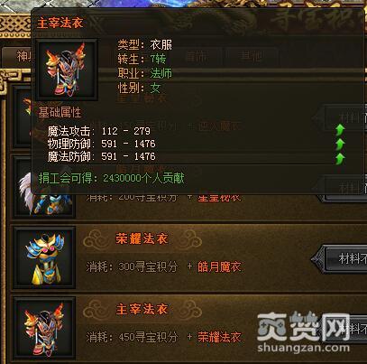 主宰法衣。类型:衣服。转生:7转。职业:法师。性别:女。基础属性——魔法攻击:112-279,物理防御:591-1476,魔法防御:591-1476,捐工会可得:2430000个人贡献。